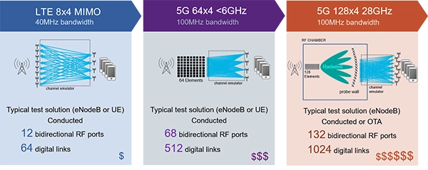 When you move to 5G, the number of antenna elements per base station increases exponentially, thus increasing the quantity of ports and digital links needed to build and emulate those configurations. The figure below gives a snapshot of these scenarios for as many as 128 antenna elements, but estimates show that 5G configurations will go higher than that, especially at millimeter wave frequencies.