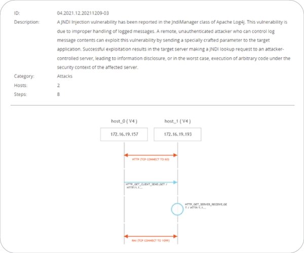 Example of CyberFlood CyberThreat Assessment (CTA) call-flow between the hosts in the Log4j attack CVE-2021-44228