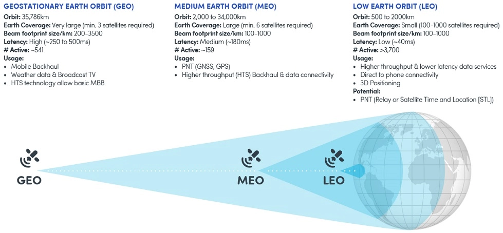 Medium Earth Orbit (MEO) satellites can be two kilometers away or nearly as far as GEOs. Like a GEO, MEOs can serve large coverage areas with a small number of satellites. They are typically used to offer Positioning, Navigation, and Timing (PNT) services as well as higher throughput backhaul and data connectivity. Well-known PNT operators serving MEO’s include the US GPS satellite system Galileo, owned by the EU, and BeiDou from China. As with GEOs, MEOs suffer from high latency (average of ~180ms), making it harder for them to compete with mobile broadband services.