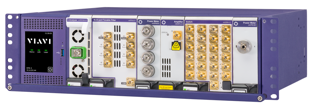 The VIAVI MAP-300 Photonic Test and Measurement System is a versatile platform designed for testing transceivers and optical connectivity in lab and manufacturing. It accommodates various test modules catering to different parameters and stages of transceiver testing. The system enables essential measurements such as optical power levels, insertion loss and spectral analysis. Signal conditioning modules like variable attenuators are used in conjunction with signal integrity and bit error rate testing. Automated testing routines and optical switching enhance efficiency in high-volume production environments, generating reports on test results for quality control. Thanks to its modular feature, users can adapt to specific design and test challenges.