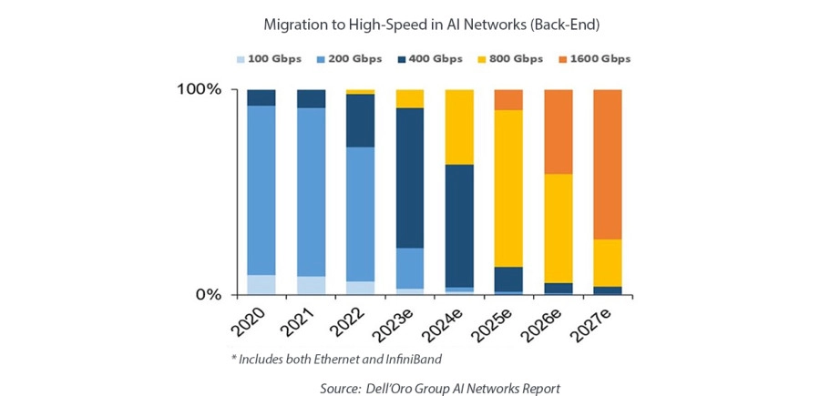 Front-end network ports are expected to remain Ethernet. Initial adoption of next generation speeds will be initially driven by front-end connectivity to AI clusters for data ingestion. By 2027, Dell’Oro expects one third of overall Ethernet ports in the front-end network will be 800 Gbps speeds or higher.