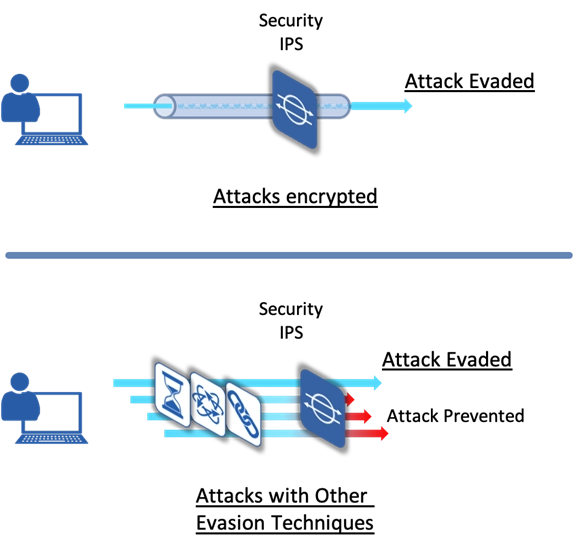 The overarching approach for these malicious actors is to disguise the exploits at the point of delivery to avoid getting detected and prevented by the enterprise security controls. Hindering a security platform’s ability to recognize and enforce mitigating policies to the attacks, encryption or evasion techniques can be applied to existing exploits, attacks and other malicious traffic.
