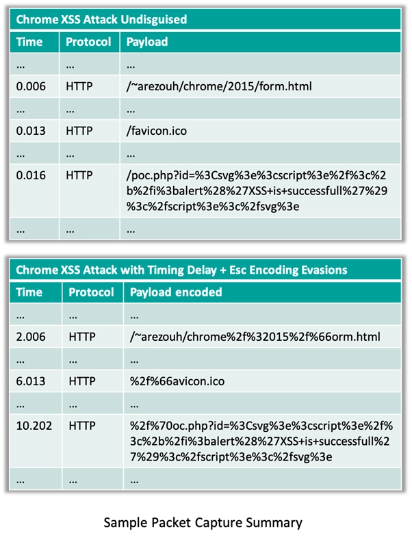 Failure to recognize any of the specific evasion techniques would make the entire class of attacks exploitable against devices that were presumed to provide protection. Furthermore, it is possible to combine relevant evasion techniques across or within each category, which is a very simple thing to do with significant rewards for malicious attackers. For example, a known Chrome Cross Site Scripting attack can be disguised with time delay and URL obfuscation (escape encoding). While this exploit may be mitigated without the evasion applied, with the combined evasion it may get past security counter measures.