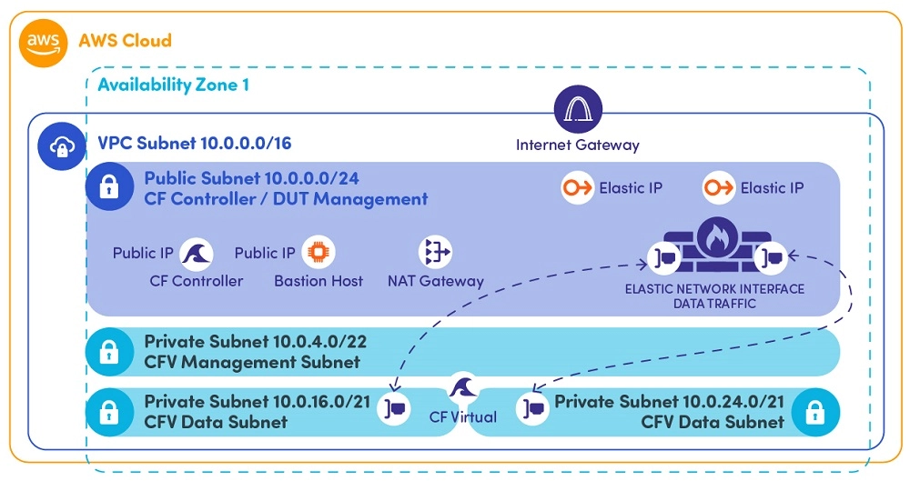 The intra-VPC virtual firewall assessment can be used to validate security policies and posture of its inspection engines and furthermore it would allow assessments of its performance under load (with malicious and non-malicious traffic).