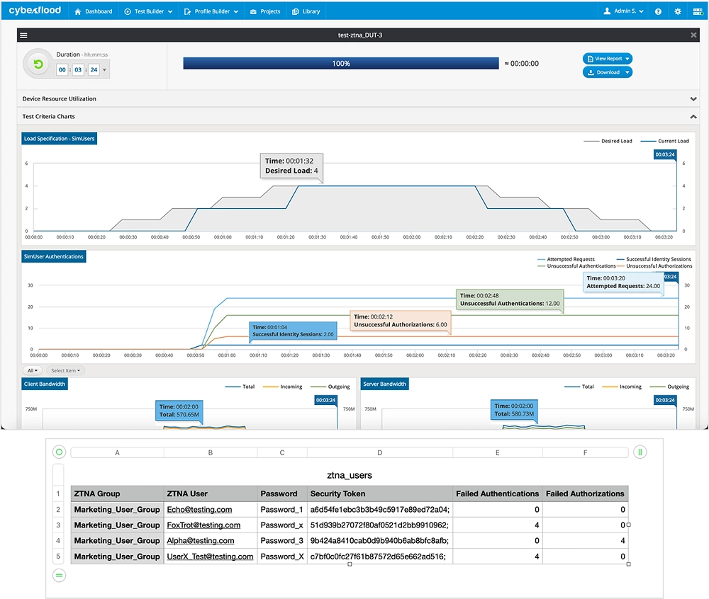The CyberFlood report shows the status and related statistics regarding authorized and unauthorized users attempting to access protected apps. CyberFlood ZTNA live and final report provides the progression of Attempted Requests, Successful Identity Sessions, Unsuccessful Authentication, and Unsuccessful Authorization. The detailed reporting also offers statistics of Failed Authentication and Failed Authorization on a per-user basis.