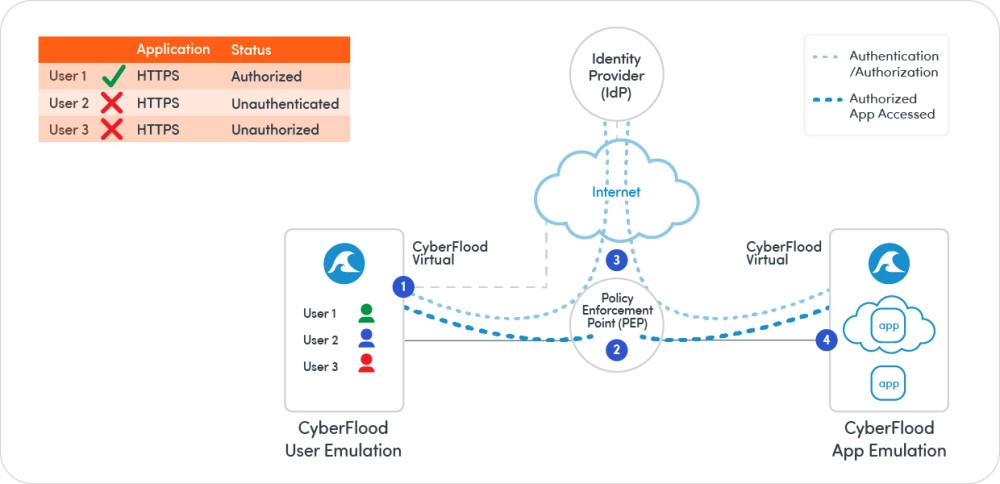 CyberFlood test agents interact with Policy Enforcement Points (PEP) and the Identity Provider (IdP) with simulated authorized and unauthorized users, emulating traffic and accessing protected applications.