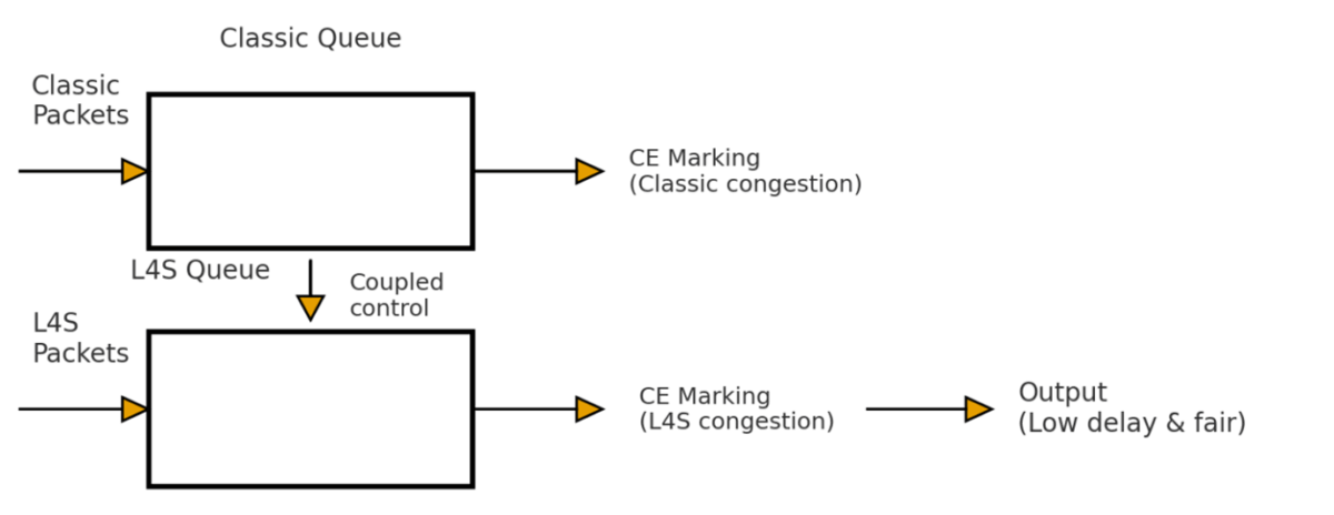 This is solved by the coupled part of L4S’s dual-queue coupled AQM. Here, the AQM implements an in-built fairness mechanism, and if the classic queue begins to become congested, the L4S queue is signaled to begin the marking of L4S packets with CE sooner and more aggressively.